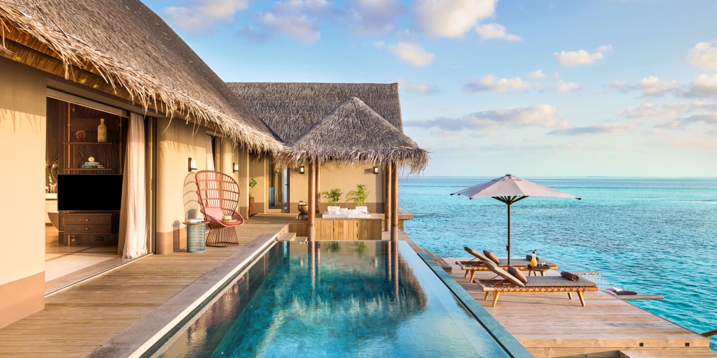 Situated on Muravandhoo Island in Raa Atoll, Joali Maldives blends striking architecture with hidden art installations, many by local women artists, scattered throughout tropical forests and along white-sand beaches. Seventy-three overwater and beach villas decorated with natural woods and blue hues dot the island. They’re complemented by five restaurants, wellness spaces, and marine conservation programs.